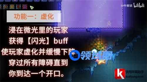 作用一:虚化(无敌免伤)当玩家浸没在此液体中时,他们会开始缓慢下落,并且穿透物块,直到进入开放空间。打boss的时候先做一个微光湖,可以躲进去规避伤害。