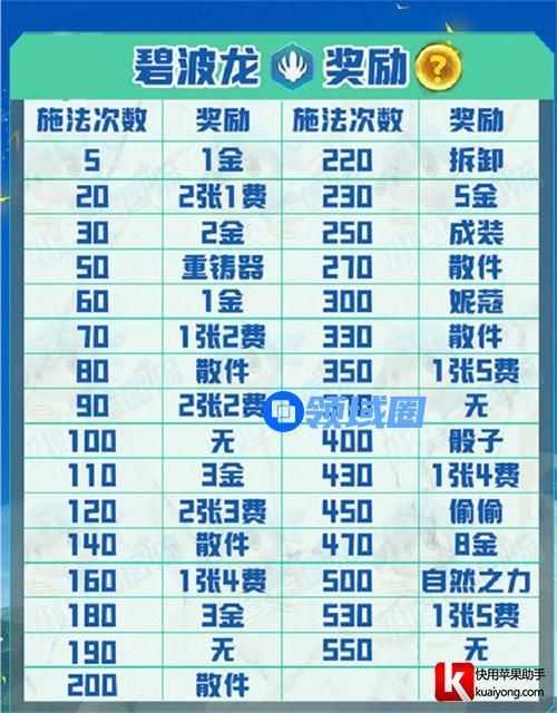 总之碧波龙层数奖励是分为固定和随机的两种类型。固定奖励是50层固定一个重铸器,300层必定是妮蔻,400层是 骰子,500层是自然之力(金铲铲冕冠)。而其他的每10层的奖励是随机给的。