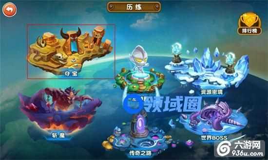 游戏主界面点击历练区域(红框显示),进入历练界面点击夺宝区域(红框显示),即可进入夺宝界面。