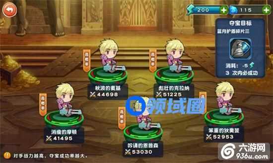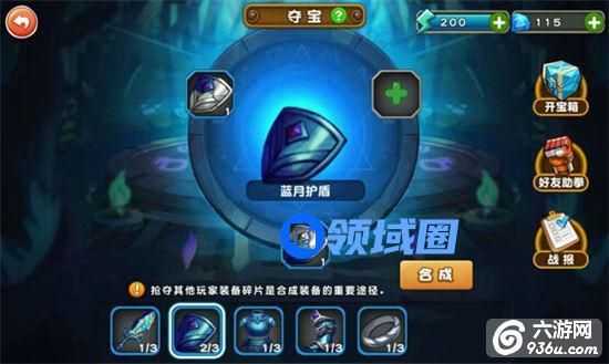 进入夺宝界面,会显示当前拥有的装备碎片,缺失的碎片可通过夺宝进行补充,集齐碎片即可合成完整装备。夺宝每次需要消耗5点精力,无论输赢。而且,对手战斗力越高,获得碎片的成功率越高。