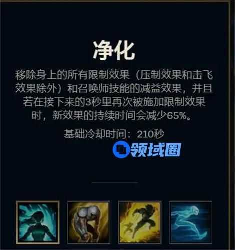 2、净化基本上可以解除各种负面状态,其中还包括召唤师技能虚弱和点燃,并且接下来的3秒内减低65%的负面状态效果,净化非常的实用,在后期也有很高的操作性。