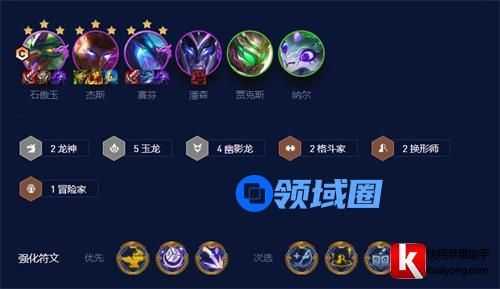 阵容组成:石傲玉,杰斯,赛芬,潘森,贾克斯,纳尔。组成2龙山5玉龙4幽影的羁绊。其中主c是石傲玉,赛芬。主坦是杰斯。