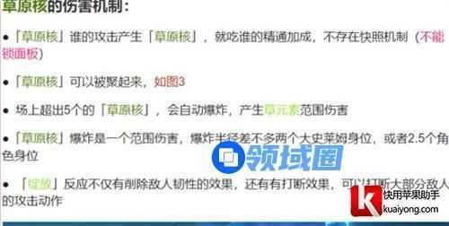 并且绽放反应玩家如果靠的太近也是会炸到自己的。并且绽放反应的爆炸是有一个降低敌人韧性的一个效过,还可以打断敌人的攻击。场上超过5个草原核就会自动爆炸产生大量的草元素伤害。并且属性是吃触发反应的角色属性。