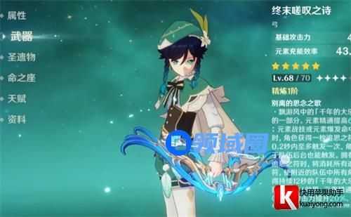 终末嗟叹之诗是温迪的专武,武器的充能词条可以给温迪带来大招的循环释放,并且武器特效给的全队加精通和攻击的效果非常的强力,基本上温迪一个大招就可以触发武器的特效非常的专武之名不是盖的。