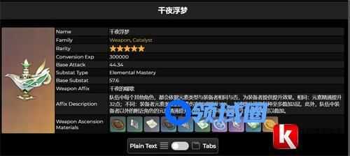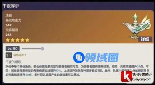 总之关于草神专武-千夜浮梦90级后有着:基础攻击力542点,元素精通265点。而简述一下武器特效就是根据队伍当中的角色的武器类型和元素类型加攻击或是元素精通。