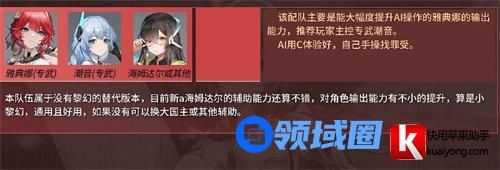 总之对于那些想要有高输出的玩家并且对于手操比较喜欢的可以选择:雅典娜(专武)+黎幻(专武)+潮音(专武)+管理猫弥摇摇。而没有黎幻的玩家可以选择雅典娜(专武)+潮音(专武)+海姆达尔或者其他角色。潮音送的自选可以选择。