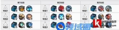 一技能起风——专精一:技巧概要·卷三*8、酮阵列*4、凝胶*4。专精二:技巧概要·卷三*12、提纯源岩*4、五水研磨石*9。专精三:技巧概要·卷三*15、晶体电子单元*6、异铁块*4。
