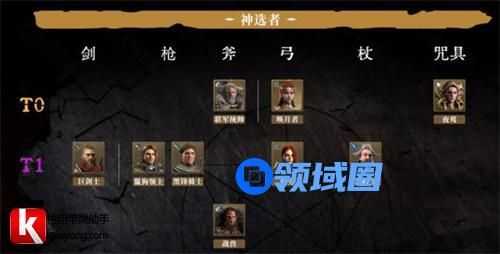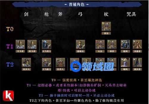 T1:巨剑士,鬣狗领主,黑锋骑士。伯劳,苦修士,守卫者,捍卫者,天马勇士,游骑兵,火法,毒法,歌鸩,圣愈者。