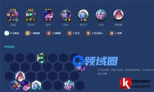 金鳞幻境迭嘉:迭嘉,艾达丝,努努,亚索,星妈,永恩,阳妈。组成8幻境(幻境转一个)3金鳞2护卫羁绊。主c迭嘉装备,羊刀,巨杀,科技枪。艾达丝主坦绿甲,石像鬼,反甲。