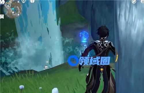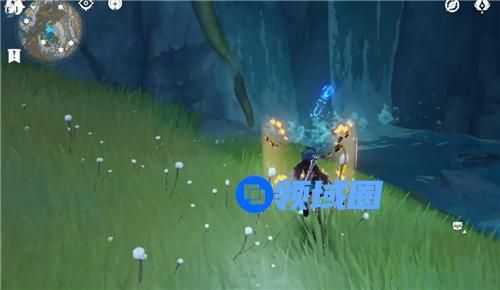 然后往宝箱的右边的瀑布这边走,可以看到第三个水元素方碑。