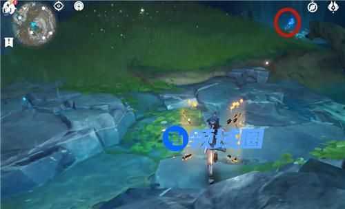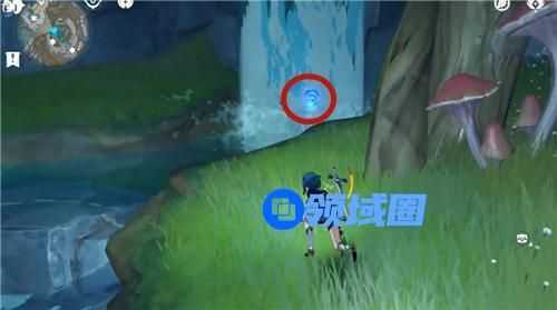 首先这三个水元素方碑,分别位于宝箱的前面、左边和右边的瀑布下。宝箱旁边的那个比较显眼,这里就不给位置图了,往左边走,瀑布的后面有一个水元素方碑,如下图所示。