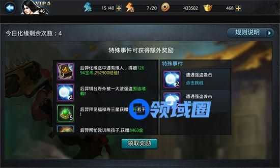 每天可以化缘4次,领取化缘奖励便会扣除一次化缘次数。当然每日凌晨3点的时候会重置化缘次数。值得注意的是,化缘途中,英雄还会遇到各种事情,其中包括一些需要战斗的特殊事件。按照剧情,特殊事件当然也会有特殊的奖励,玩家可以操控化缘英雄进行战斗来获得珍稀奖励。