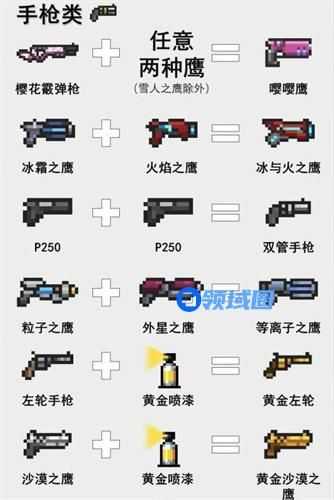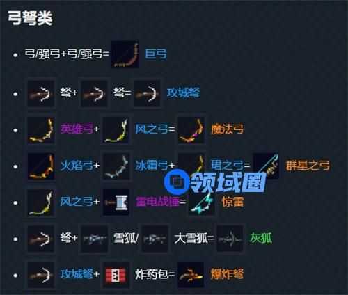 以上就是游戏中武器的配方了,每把武器的功能都是不同的,如果有不知道怎么合成的小伙伴,可以对应上方的介绍进行合成。