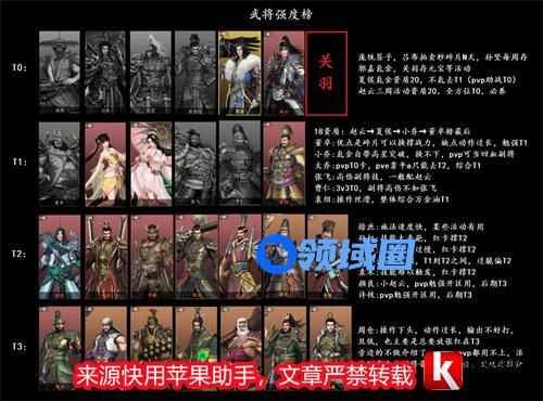 总之以上就是开服角色的强度排行榜了,在T0当中赵云是可以在活动当中获取20资质的,而关于是需要存元宝等关羽列传活动。而其他的角色基本与平民无缘,需要氪金,或者长时间的兑换碎片。