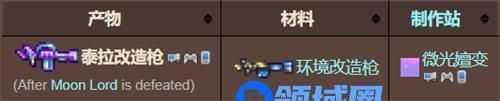 总之泰拉改造枪是玩家使用1个环境改造枪在制作站微光嬗变合成1个泰拉改造枪。并且是只有在1.4.4版本才支持微光这个道具,而之前的版本是没有微光和泰拉改造枪的。
