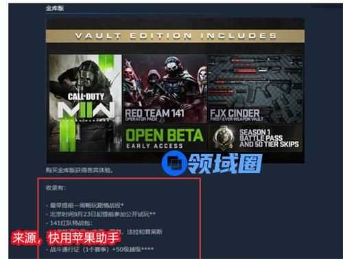 金库版:玩家是可以提前一周游玩战役剧情(单机),然后还有专属的141红特战包:4名特遣队员:幽灵、肥皂、法拉和普莱斯;还有FJX灰烬首发武器库;最后还有战斗通行证(1个赛季) 50级越级。