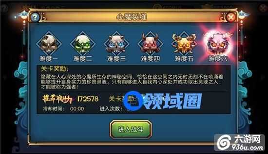 心魔裂缝是重要获得灵液的活动,心魔裂缝拥有6个不同难度,分别对应不同的推荐战斗力和敌方阵容。小伙伴们可选择适合自己的难度进行挑战。