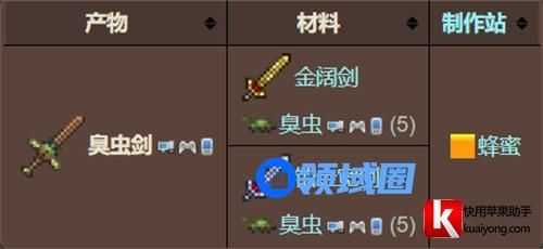 总之臭虫剑是玩家使用金阔剑或者铂金宽剑使用臭虫*5和蜂蜜合成的。臭虫剑是当前第二个以攻击和击退NPC的武器,第一个是臭蛋。这里是不推荐击杀NPC的,因为后期有非常多的道具都是在NPC哪里换的。