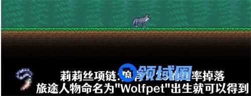总之莉莉丝的项链是玩家在1.4.4版本当中,击杀狼就有1/30 (3.33%) / 1/25 (4%) 的几率掉落,和创建名称为“Wolfpet”或“Wolf Pet”的旅行模式就会自动获取该道具,个人认为是开荒的新道具。