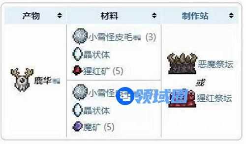 1、鹿角怪召唤物需要:3个小雪怪皮毛、1个晶状体、5个猩红矿或魔矿。