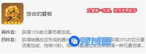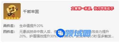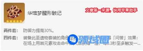 过渡套:2华馆+2磐岩。解析:华馆的2件套的20%的防御力和磐岩两件套的15%的岩伤加成是非常的稳定,并且在圣遗物词条上面比较的好选择,容易成型。