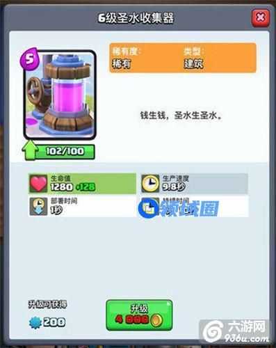 圣水收集器升级只增加血量,其他数据没有变动,意味着即使1级的圣水收集器也可以生产出7费,但是血量太低容易被法术和单位轻松消灭,无法达到赚费的效果。很多时候,需要精细的操作和兵种克制应用才能够赚取费用,但是圣水收集器在没有被攻击的情况下是可以稳定赚取2费,并且是缓慢输出,类似于费 用储存,因此圣水收集器在优势阶段是一个继续扩大优势的稳定选择,当然也存在风险,就是送掉优势甚至被一波通关。