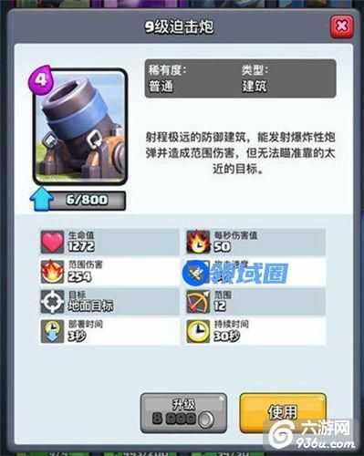 迫(pai)击炮经过修改之后,变成了目前非常流 行强势和稳定的一张牌。基础数据来说,迫击炮的射程是12,血量很优秀,单发伤害很高并且是范围伤害,很容易打死皇家塔周围的单位(比如公主、弓箭手和哥布林),目标锁定比较特殊,施放时小圈之内的目标无法攻击,大概射程是4-12之间的范围。迫击炮的持续时间只有30秒,部署时间需要3秒,看似很笨重, 但是考虑到迫击炮4费的消耗和高额的血量及伤害,很多时候是稳定的远程范围输出,也就是不讲道理的轰炸。迫击炮理论上可以打6发,9级可以累计造成1554点范围伤害,十分惊人,虽然很容易被攻击导致连发失败,但是作为一个嘲讽单位,迫击炮很容易引诱对方盲目进攻亏费,最终在下一波攻势中崩盘。