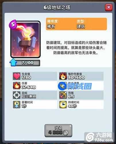 地狱塔被大家亲切地称为:爸爸塔,因为地狱塔是各种单体慢速单位的克星。地狱塔的特点在于递增性伤害,射程也非常优秀,同时血量不俗,值得5费的高费。经过一次削弱地狱塔的存活时间减少了20秒,并不影响它的统治性地位,在目前巨型单位流行的环境中,地狱塔作为一张针对牌表现很出色。同样的,单个单位的远程输出也无法和地狱塔抗衡,即使是火枪手,也无法单挑换掉地狱塔。当然地狱塔的弱点就是需要输出时间,多个小单位可以有效分散地狱塔的输出,王 子的冲锋配合小单位很容易短时间摧毁地狱塔,所以地狱塔不能完全单独应对大部队,需要其他单位辅助输出和分担伤害。