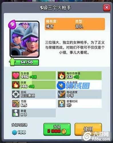 紫发美眉*3,理论上赚了3费,实际上比较笨重的一张卡牌。属性和同级火枪手完全一样,但是需要9费施放。目前比较流行的三个火枪手应用是圣水收集器积累费用,巨人前方吸收伤害,三个火枪手后排安全输出,后来优化为大皮卡前排进攻,火枪手在后,战斗力更加强大但是费用也更加笨重。三个火枪手相当于群体输出单位,同时对单体的伤害也非常高,对付各种目标都游刃有余,当然近身战斗还是比较薄弱。