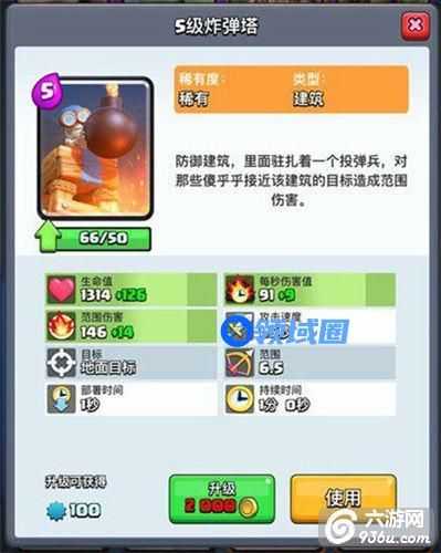 炸弹塔虽然高达5费,也不能对空攻速和弹道偏慢,但是不影响它的出色发挥。炸弹塔的特定是群体伤害,远距离射程以及异常高的血量,同时存在时间长达1分钟,让它能够稳定防守各种单位。即使是无法反击工作单位、单体输出较低,但是高血量可以有效地承担伤害,配合对空单位和法术,炸弹塔绝对是一道坚 实的防线。