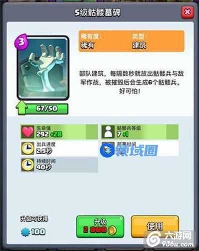 单卡应用主要是侧面施放让高攻单体攻击单位伤害溢出,吸引仇恨延缓其行动,放下之后瞬间产出小骷髅可立即吸收一次攻击输出,爆炸后4个小骷髅也 能明显干扰慢攻速单位的进攻和目标锁定。骷髅墓碑对王子、大小皮卡和野猪骑士的阻挠作用很明显,其他情况下不太得力,个人使用不多,没有丰富的心得,欢迎 各位补充。