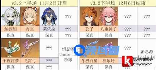 根据岩层舅舅的爆料3.2版本上半卡池为草神-纳西妲,复刻角色宵宫,以及新四星角色-莱依拉。武器池,飞雷之弦振+千夜浮梦(草神专武)。可以说武器池非常的良心。