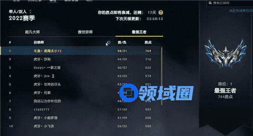 这个玩家是一个斗鱼主播,在1月9日23点44分,以【764胜点】成功第一个晋级成为最强王者,大家可以前往斗鱼搜索格局即可找到,格局从新赛季开始,然后直接连续35小时的单双排,最终是完成了王者800分的冲分,晋级成为最强王者。
