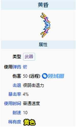 黄昏:可以自动发射五条多彩的彩虹(如果使用木箭作为弹药)。此弓发射的每五条箭矢中的一条会造成正常伤害的两倍。每支箭矢最多可以穿透四个敌人,且可以通过在射击时移动光标来分散它们。