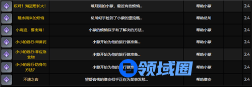 小小的远行有一些列任务,这些任务有「哎呀!海盗想长大!」、「随水而来的烦恼」、「小海盗,要出海!」、「小小的远行·常备药」、「小小的远行·非应急食物」、「小小的远行·防身的方法?」。