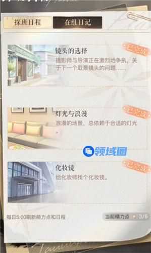 每天有六点精力,会在凌晨五点刷新精力点,还有新的日程,每一点精力点可以处理一个日程,也就是每天六次,刷满以后要合理的分配,游戏中的日程基本上就是选择题,会有普通和完美等级,普通三十点好感度,完美五十点应该