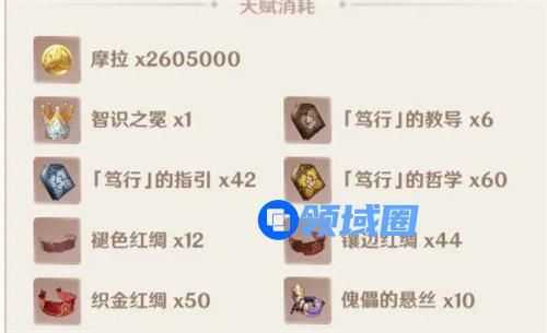 迪希雅天赋升级一共需要:笃行的教导*9、笃行的指引*63、笃行的指引*114、褪色红绸*18、镶边红绸*66、织金红绸*93、傀儡的悬丝*18、摩拉496w。