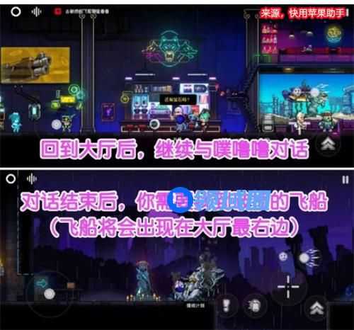 3、回到大厅后,继续与噗噜噜对话需要找到破损的飞船(飞船将会出现在大厅最右边)