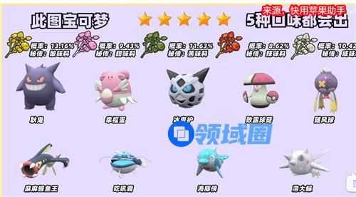 备注:秘传调味料也是有很多种的,酸味料,甜味料,苦味料,辣味料,咸味料。并且这些不同口味的秘传调味料是在不同的宝可梦太晶战当中概率是不一样的具体如下图: