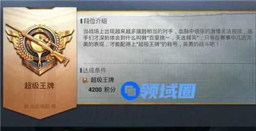 言归正传,排位分达到4200分就能成为超级王牌,一般来说一把能加个十多分,打个几百场才能成为超级王牌或者无敌战神。段位能上铂金的特种兵,就算是把游戏玩明白了。