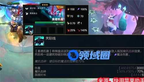 铁男技能:莫德凯撒展开领域,粉碎所有敌人百分之五十的魔抗,然后在身后召唤一座建筑砸到棋盘上,对所有被命中的敌人造成450的魔法伤害。三星后是减70%的魔抗,和3000点的伤害,但段数6次,伤害非常的高。