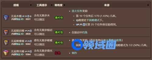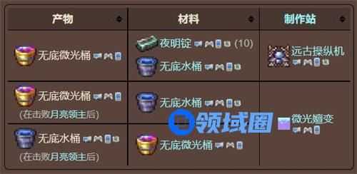 备注:无底水桶可以用来制作无底微光桶。玩家使用10个夜明锭和无底水桶和无底微光桶。