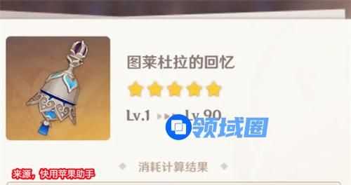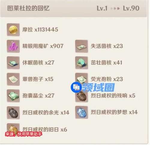 图莱杜拉的回忆90级全部材料:烈日威权的残响x5,烈日威权的余光x14,烈日威权的梦想x14,烈日威权的旧日x6,蕈兽孢子x15,失活菌核x23,休眠菌核x27,茁壮菌核x41,荧光孢粉x23,孢囊晶尘x27,摩拉x1131445,精魔矿x907。