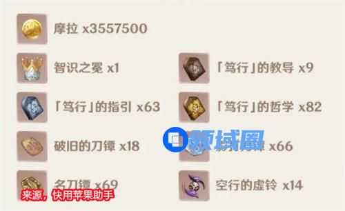 笃行的哲学*12、名刀镡*9、空行的虚铃*2、摩拉*450000