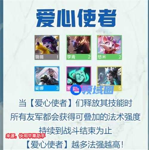 爱心使者羁绊效果:当【爱心使者】释放技能的时候,所有的友军都会获得可叠加的法术强度,该效果将持续到战斗结束。爱心使者的羁绊等级越高,获得的法术强度加成越高。