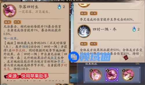 二技能——【华落四时生】:无法暴击,初始每提升1%暴击伤害,则自身造成伤害提升1%,暴击抵抗提升0.5%技能释放后牺牲24%最大生命值,展开2回合「四时一隅」,自身获得一层四季流转效果。根据季节来施加对应增益或者回复效果;