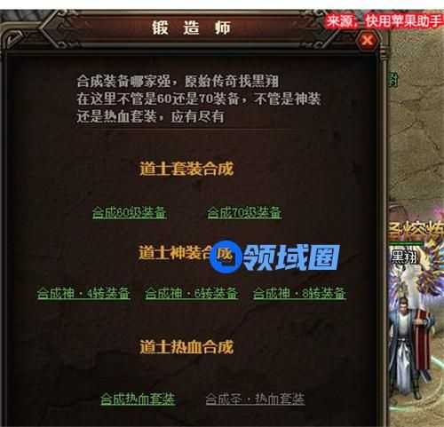 锻造师功能:可以合成散装以及套装备,当然还有极品的转生装备,包括象合成60级装备,以及70级装备。
