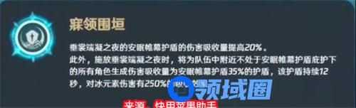 一命效果:【寐领围垣】——垂裳端凝之夜的安眠帷幕护盾的伤害吸收量提高20%。此外,施放垂裳端凝之夜时,将为队伍中附近不处于安眠帷幕护盾庇护下的所有角色生成伤害吸收量为安眠帷幕护盾35%的护盾,该护盾持续12秒,对冰元素伤害有250%的吸收效果。