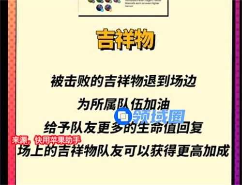吉祥物羁绊效果:被击败的【吉祥物】会退到场边为队伍加油,使队友额外获得生命值回复。其他【吉祥物】获得的加成会更高!