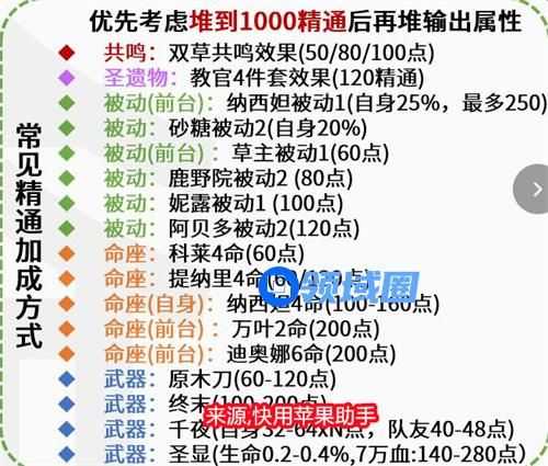 解析:因为0命草神想要吃满天赋的精通辅助效果就需要1000精通,然而因为双草的加元素精通,以及柯莱以及武器等原因,正常的情况下对于平民玩家堆800就够了。
